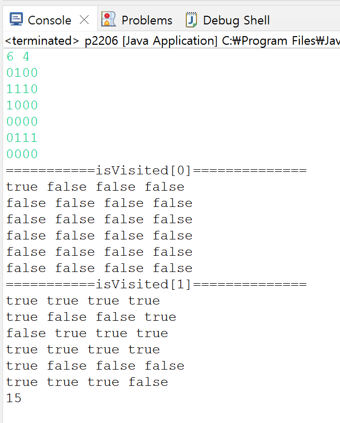 문제의 입력1에 대해 bfs를 실행하고 나면 isVisited가 아래의 사진과 같이 됩니다.