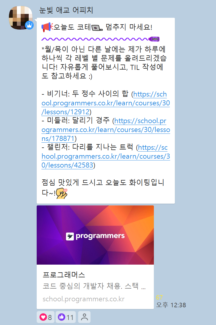 잠을 자고 일어나니,, 오늘의 코딩 문제도 출제해주셨더라구요! (월, 목에만 문제를 주시는 줄 알았는데 아니어서 넘 좋았습니다..ㅎㅎ)