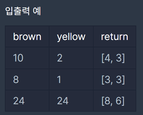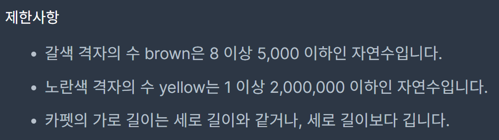 제한사항에 카펫의 가로 길이(x) >= 세로길이(y)가 나와있으므로
