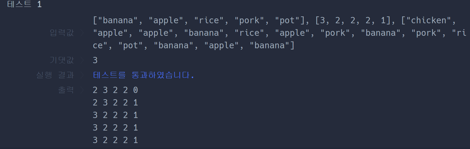 // 1 - 치킨, 2 - 사과, 3 - 사과(1), 4 - 바나나(1), 5 - 쌀(1)
