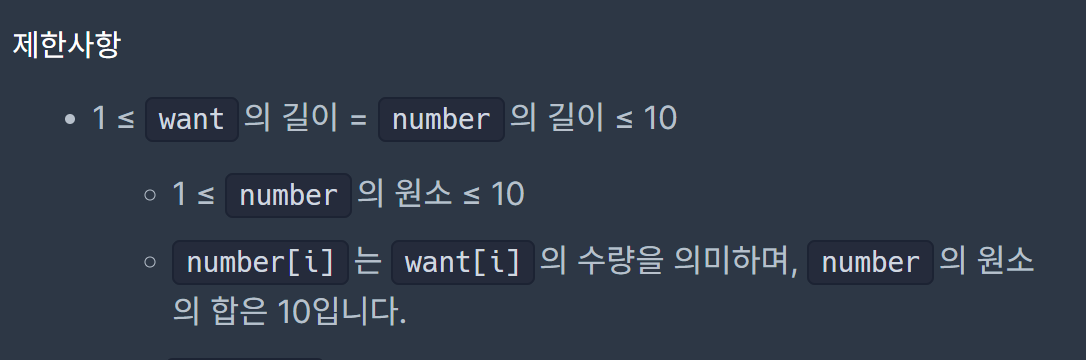 첫 번째 HashMap인 map은 want와 number에 대한 정보가 담겨있는 map입니다. (key-want값, value-number값)