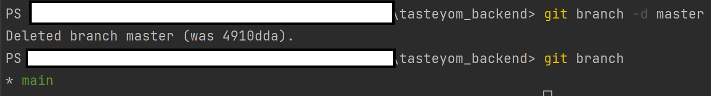 git branch -d master 명령어를 이용해 local에 있는 master 브랜치를 지웠습니다.