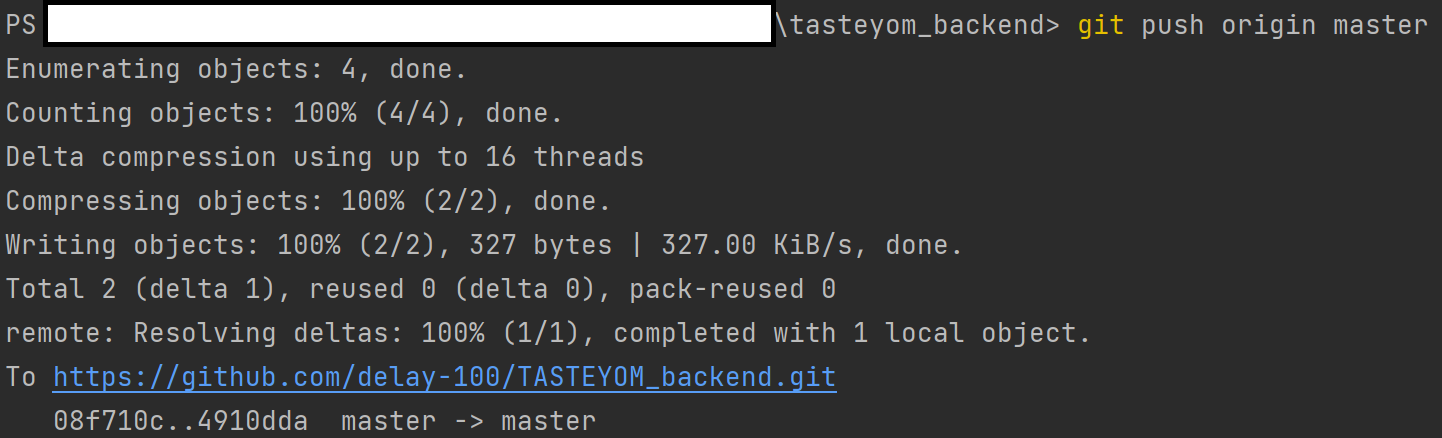 따라서 git push origin master 명령어를 이용해 다시 origin/master를 최신화 시켜줍니다.