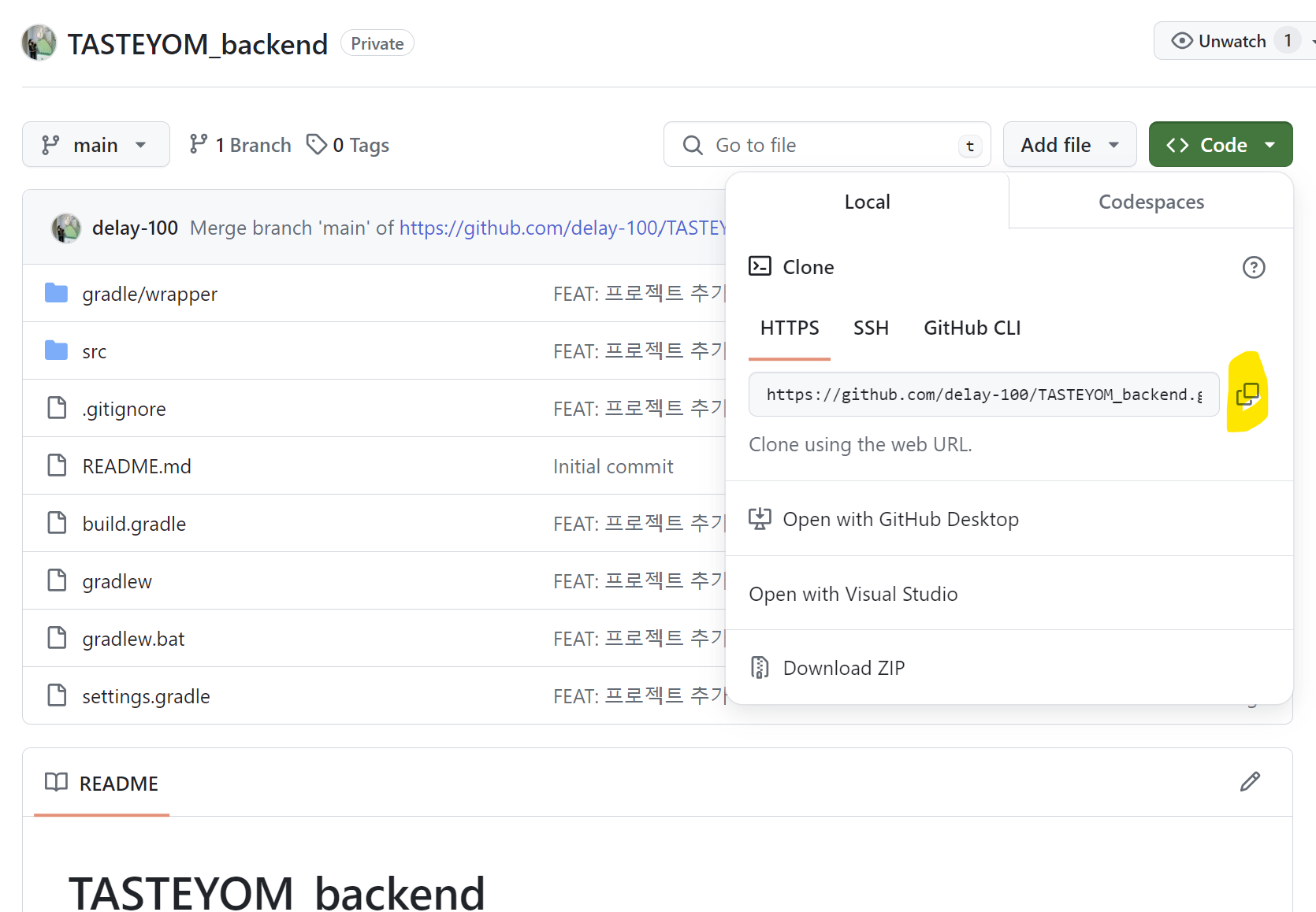 해당 링크는 github 사이트의 repository 내의 Code를 클릭하면 복사하기가 나옵니다.