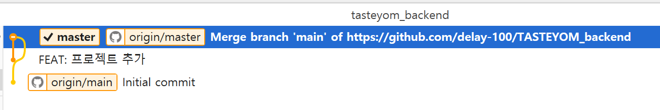 git merge origin/master를 이용해 main 브랜치에 origin/master 내용을 병합해옵니다.
