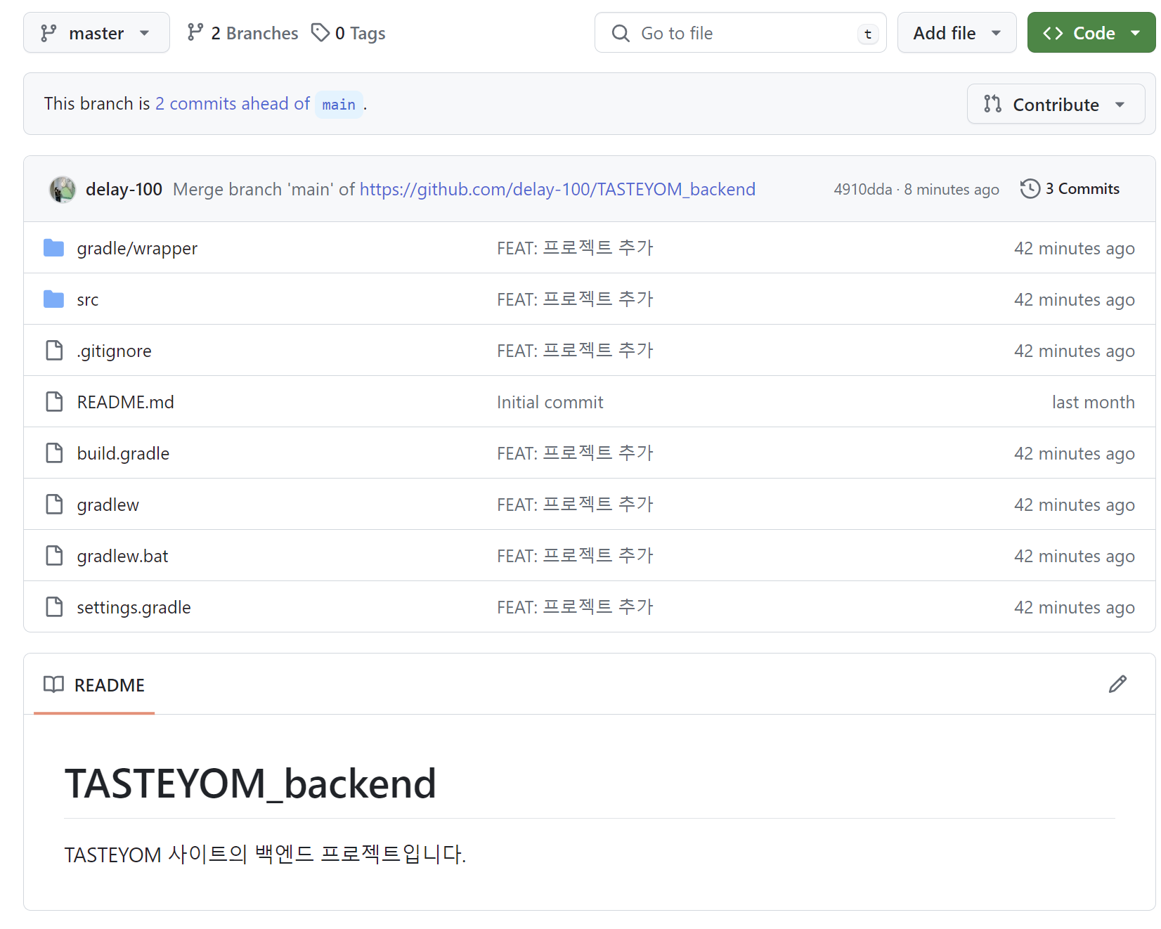 브랜치도 1개 남고, 우리의 프로젝트와 README.MD도 잘 들어가게 되었습니다.