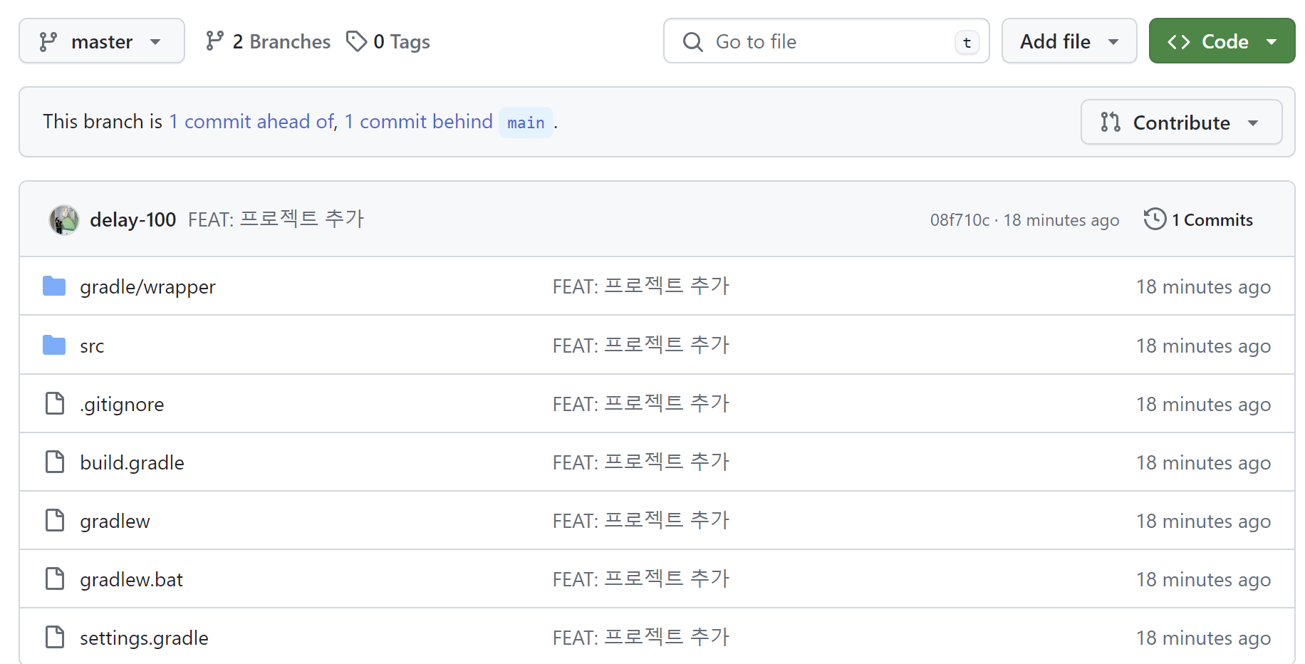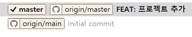 github에서 확인 시 원격(origin)에 master 브랜치가 생성된 것을 볼 수 있습니다.