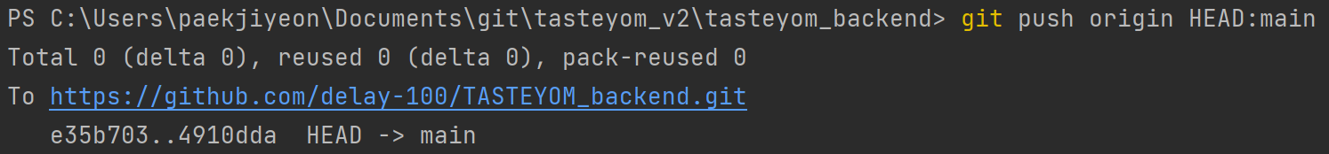 그리고 여기서는 git push origin main이 아닌, git push origin HEAD:main을 써주어야합니다!(중요)