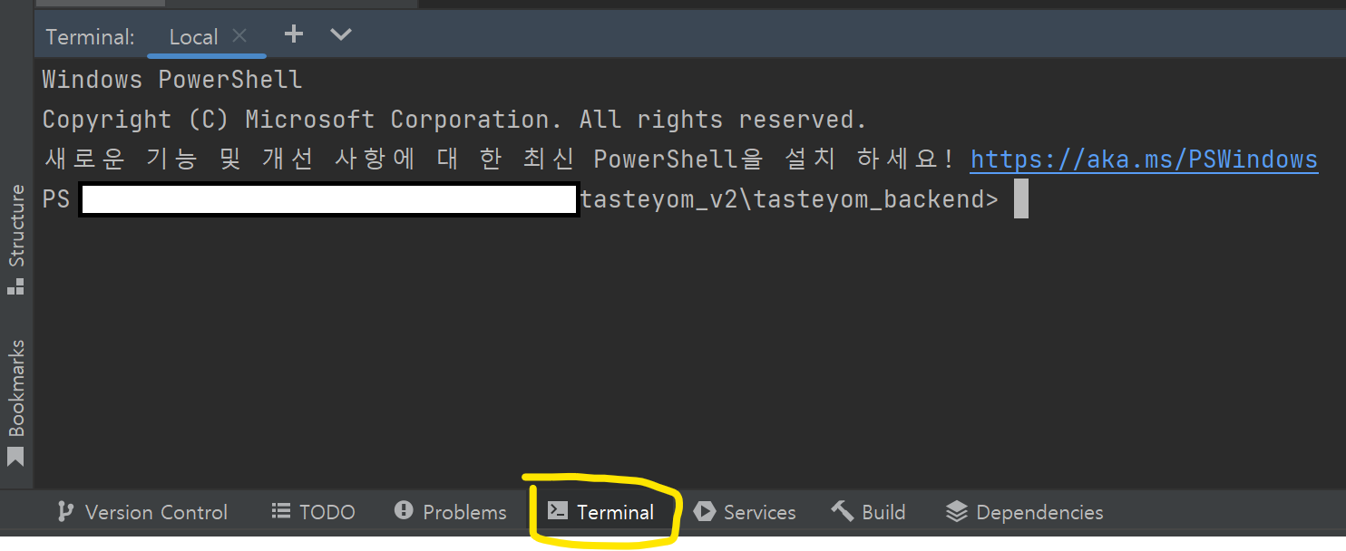이렇게 킨 후에, IntelliJ 하단의 Terminal을 클릭하면 아래와 같은 상태가 됩니다.