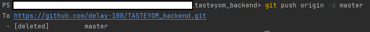 git push origin -d master 명령어를 이용해 origin에 있는 master 브랜치를 지웠습니다.