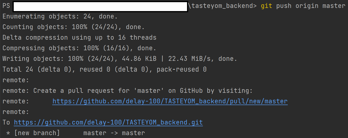 git push origin master 명령어를 이용해 원격(github)상에 master 브랜치를 만들어주면서 현재 local master 브랜치의 내용을 반영시켰습니다.