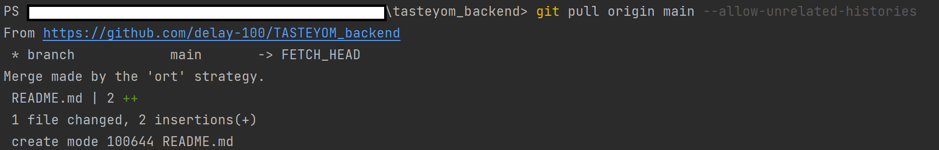 git pull origin main --allow-unrelated-histories 명령어를 이용해 master 브랜치에 기존 main 브랜치를 pull합니다.