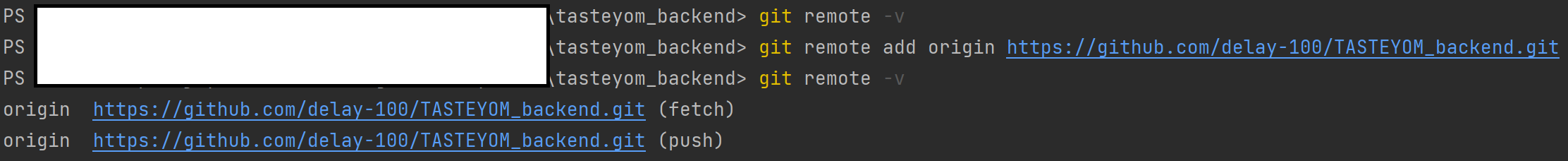 그리고 다시 git remote -v 명령어를 이용해 연결을 확인합니다. 사진과 같이 origin + 링크가 뜨면 연결된겁니다!