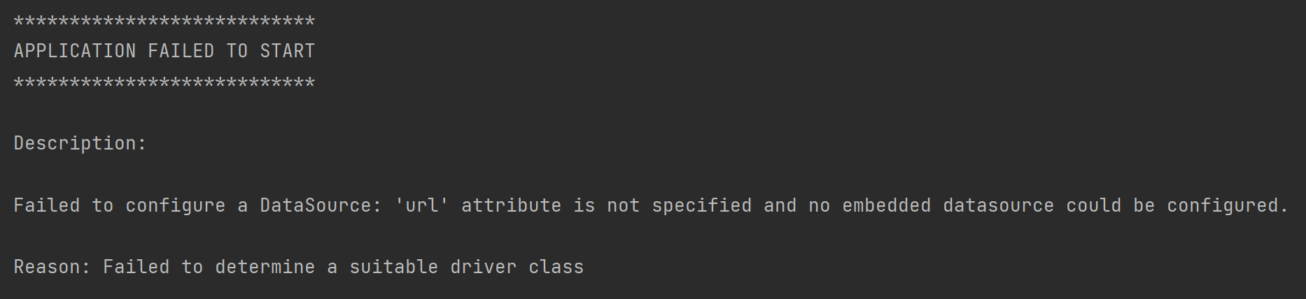 Failed to configure a DataSource 에러와 원인과 해결 방법 메시지 Failed to configure a DataSource: 'url' attribute is not specified and no embedded datasource could be configured. *************************** APPLICATION FAILED TO START ********