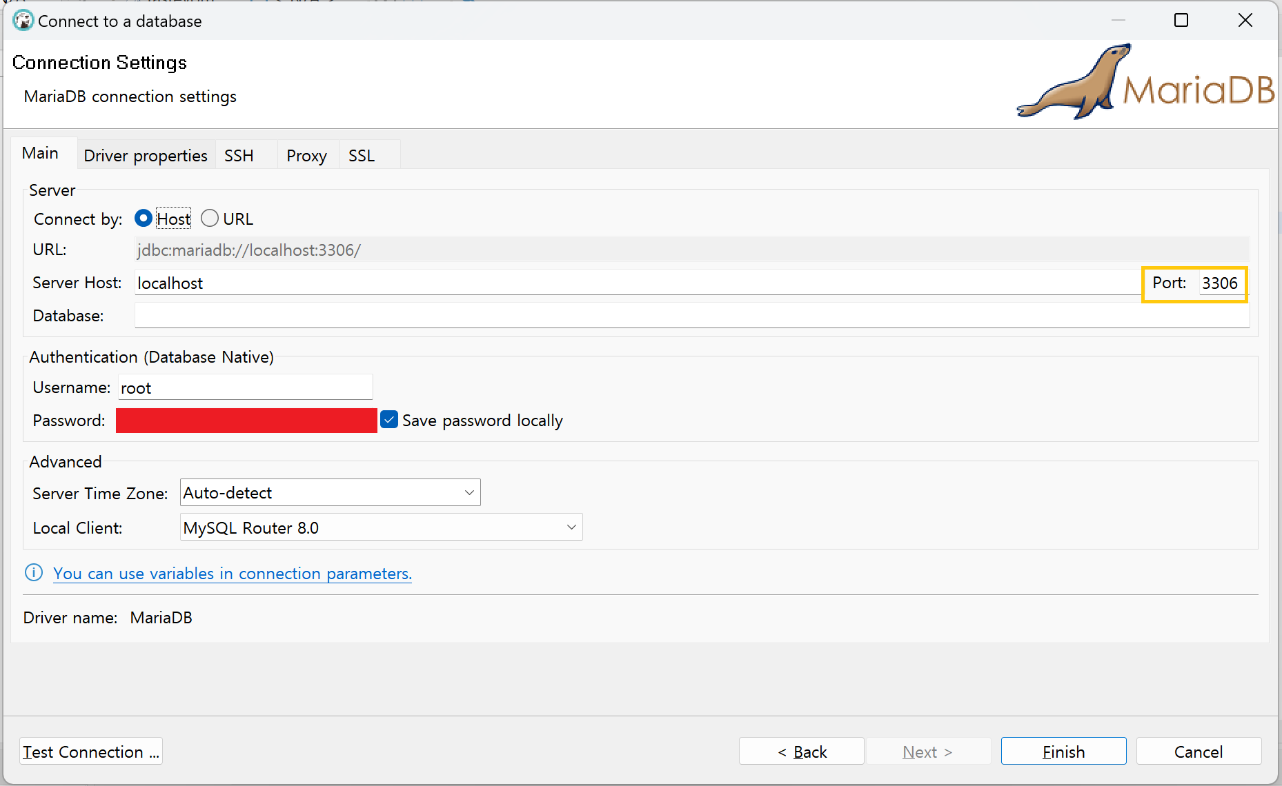 노란색 박스 안에 있는 Port는 mariaDB의 기본 포트번호가 3306이라는 사실을 확인하시면 됩니다.