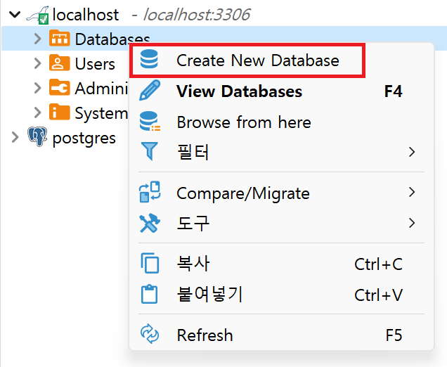 2. DBeaver로 데이터베이스 만들기(프로젝트에서 사용하는 데이터베이스)
