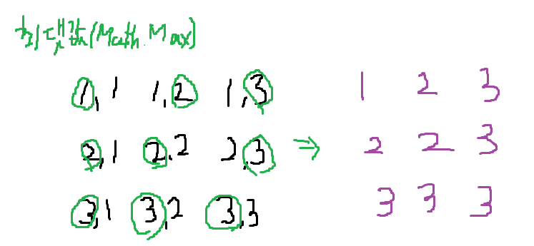 그래서 검색을 해본 결과.. 행, 열 중 최댓값을 구하면 해당 값이 그 위치에 있는 값임을 알 수 있었습니다..