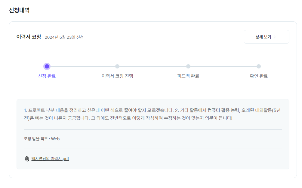 이렇게 작성한 이력서 초안을 바탕으로, 이력서 코칭을 신청했습니다!