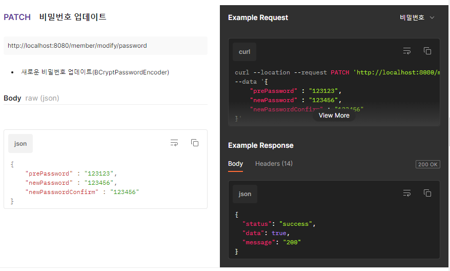 로그인 시 프론트에 반환했던 JWT토큰을 넘겨받고 SpringSecurity의 AuthorizationFilter에서 인가 처리가 되어 API에 접근됩니다. 기존 비밀번호, 새 비밀번호, 새 비밀번호 확인 문자열을 프론트 측에서 RequestBody로 요청받습니다.