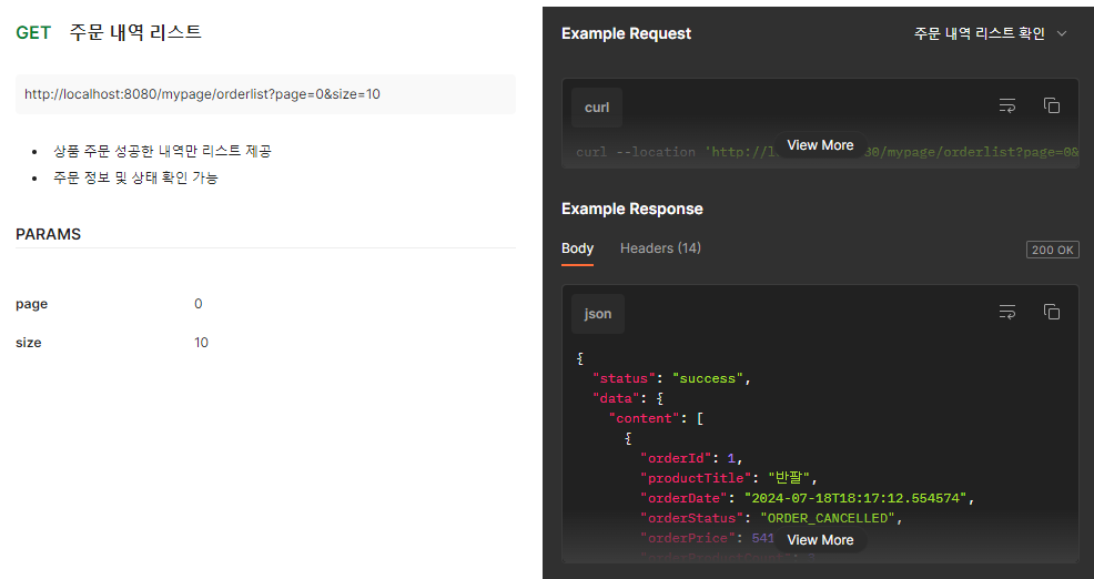 위에서 주문한 정보에 대해 상세 주문 정보와 리스트 정보를 보여줍니다. 간단하게 GET 메소드 2개로 구현했습니다.