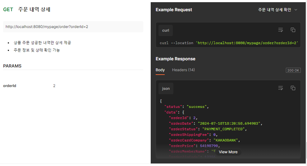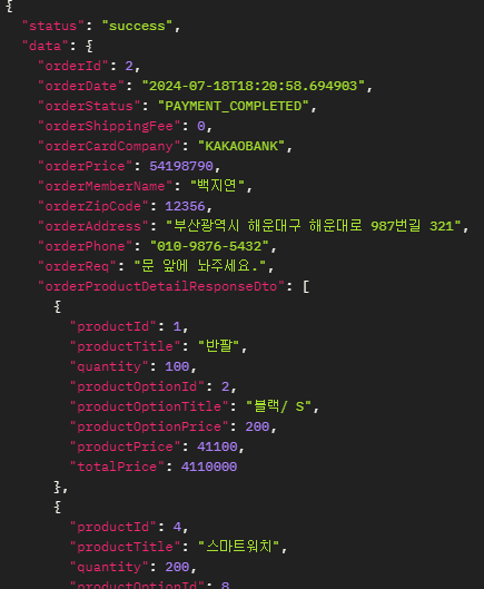예시 응답데이터는 위와 같습니다. 응답데이터는 주문 정보와 주문 상품 정보가 모두 포함되어 있습니다.