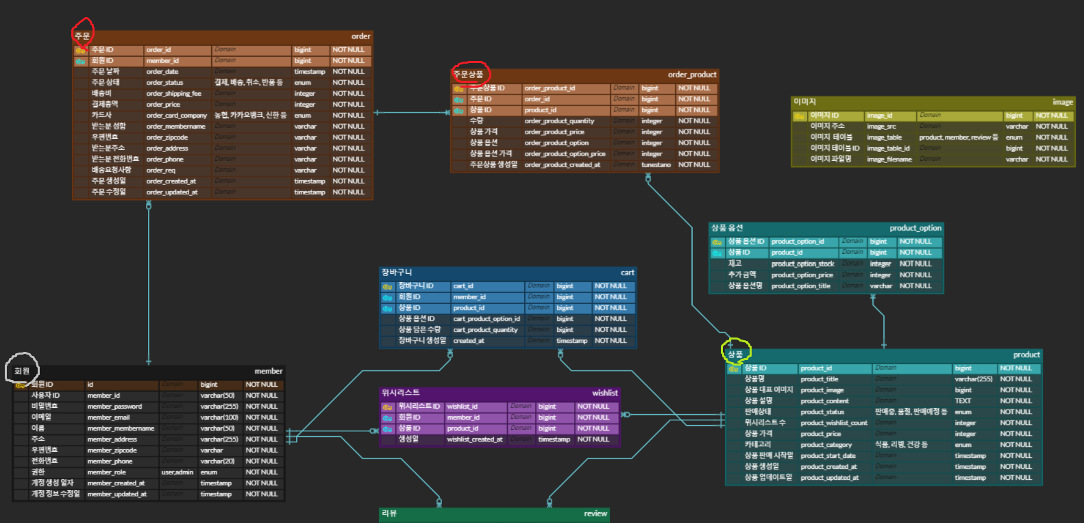 한가지 더 고민해야할 점은 현재 ERD가 아래와 같습니다. 주문을 하기 위해서는 주문 하나만 하면 안되고, 주문상품도 만들어야합니다. 무조건 주문 1개에 주문상품 1개 이상이 있어야 합니다.