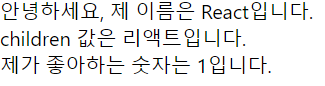 return <MyComponent>리액트</MyComponent>; // src/MyComponent.js의 props.children 값