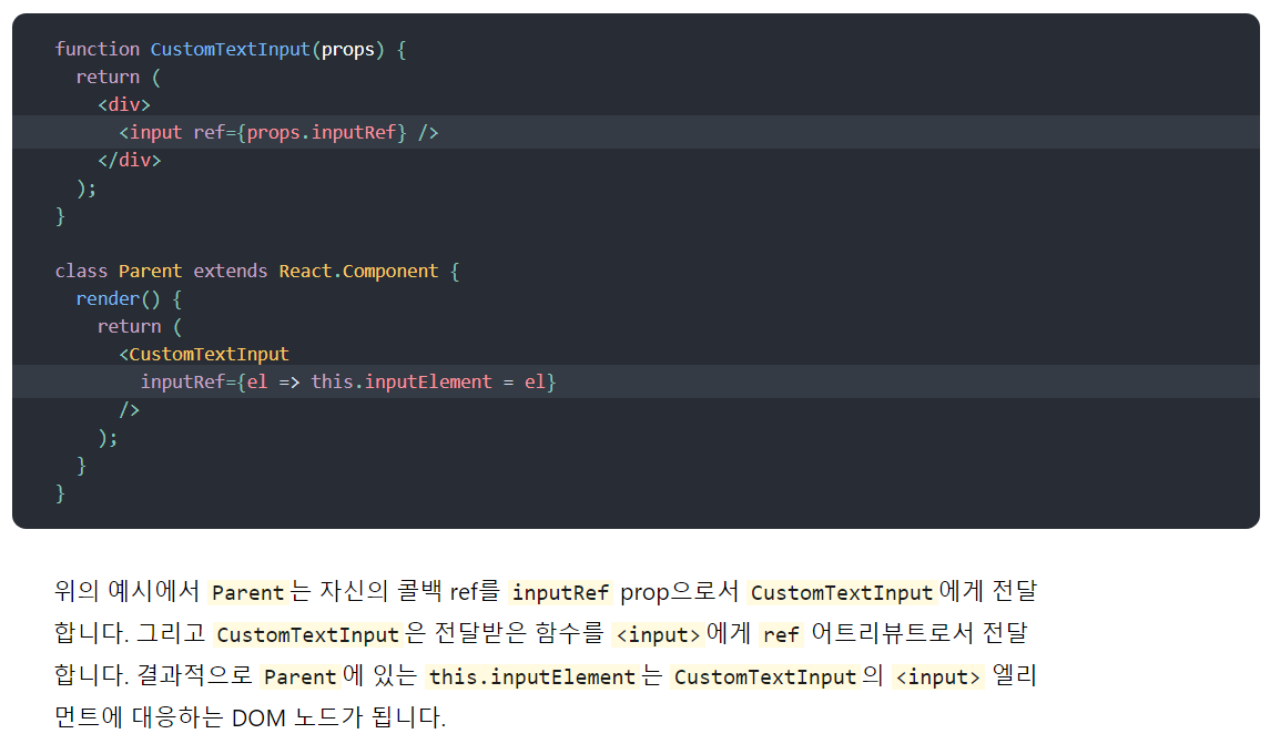 ref를 달고자 하는 요소에 ref라는 콜백 함수(제일 처음의 ref, 아래에서는 inputRef)를 props로 전달하면 됩니다. 이 콜백 함수는 ref 값을 파라미터로 전달받습니다. 그리고 함수 내부에서 파라미터로 받은 ref를 컴포넌트의 멤버 변수로 설정해줍니다.