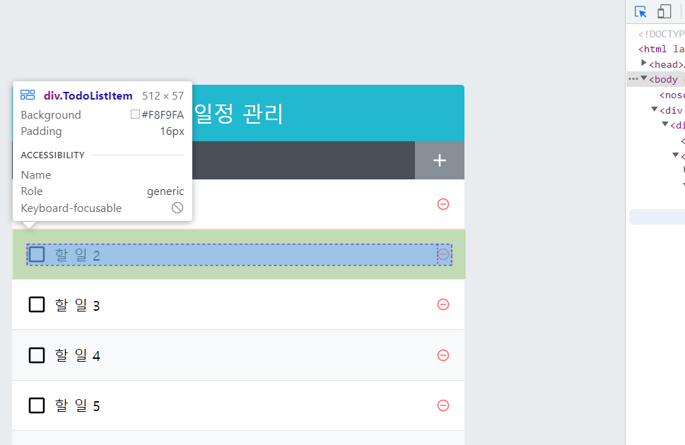 TodoList의 개별 항목인 TodoListItem에 대해 style 설정도 해줍시다. 아래의 코드를 적용시키지 않으면 스타일이 이상하게 나옵니다.